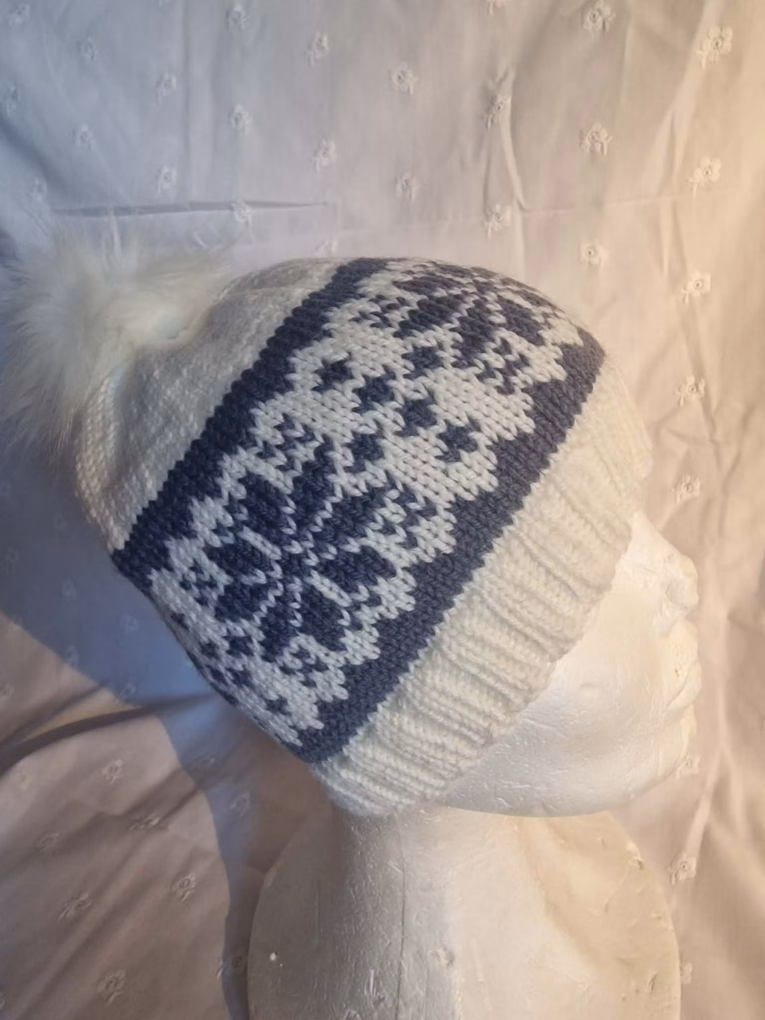 Kjempeflott hvit strikkelue med mønsterbord i fargen Jeansblå.