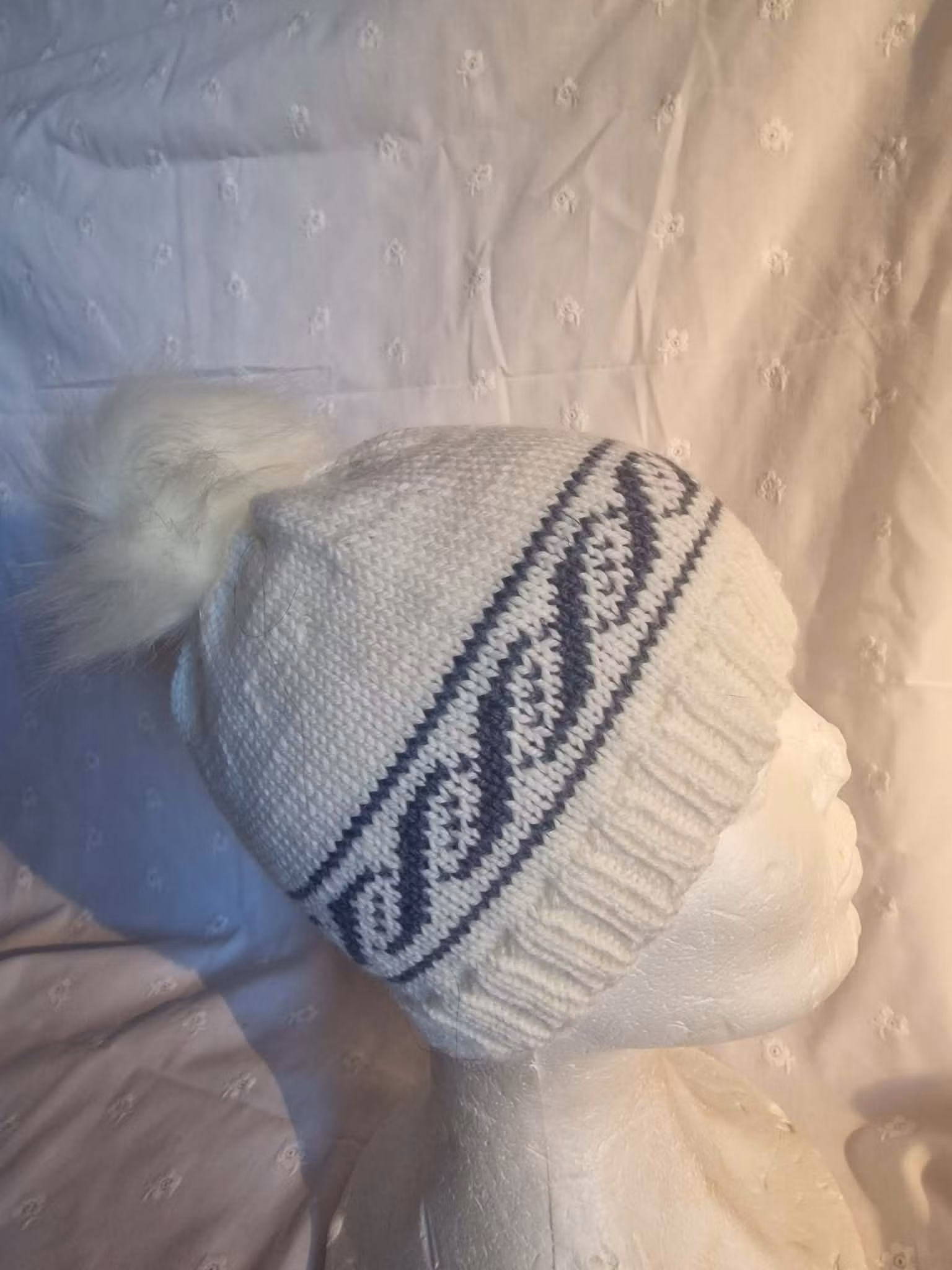 Kjempeflott hvit strikkelue med mønsterbord i fargen Jeansblå.