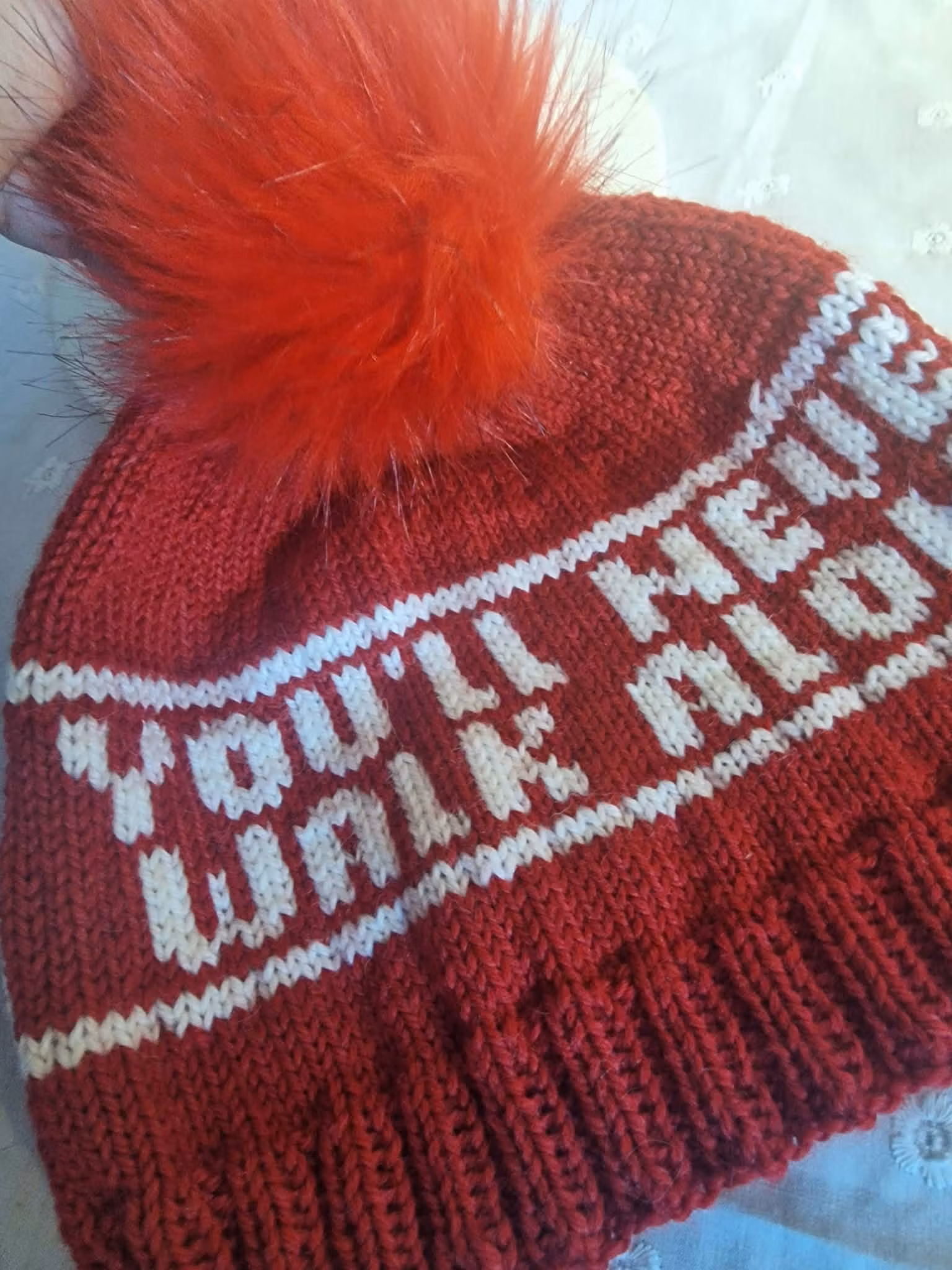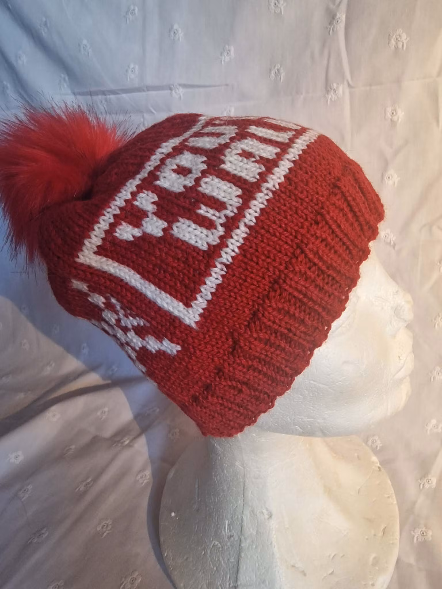 Luen har stor rød dusk som lett kan tas av ved vask då den er satt på med trykkknapp:)