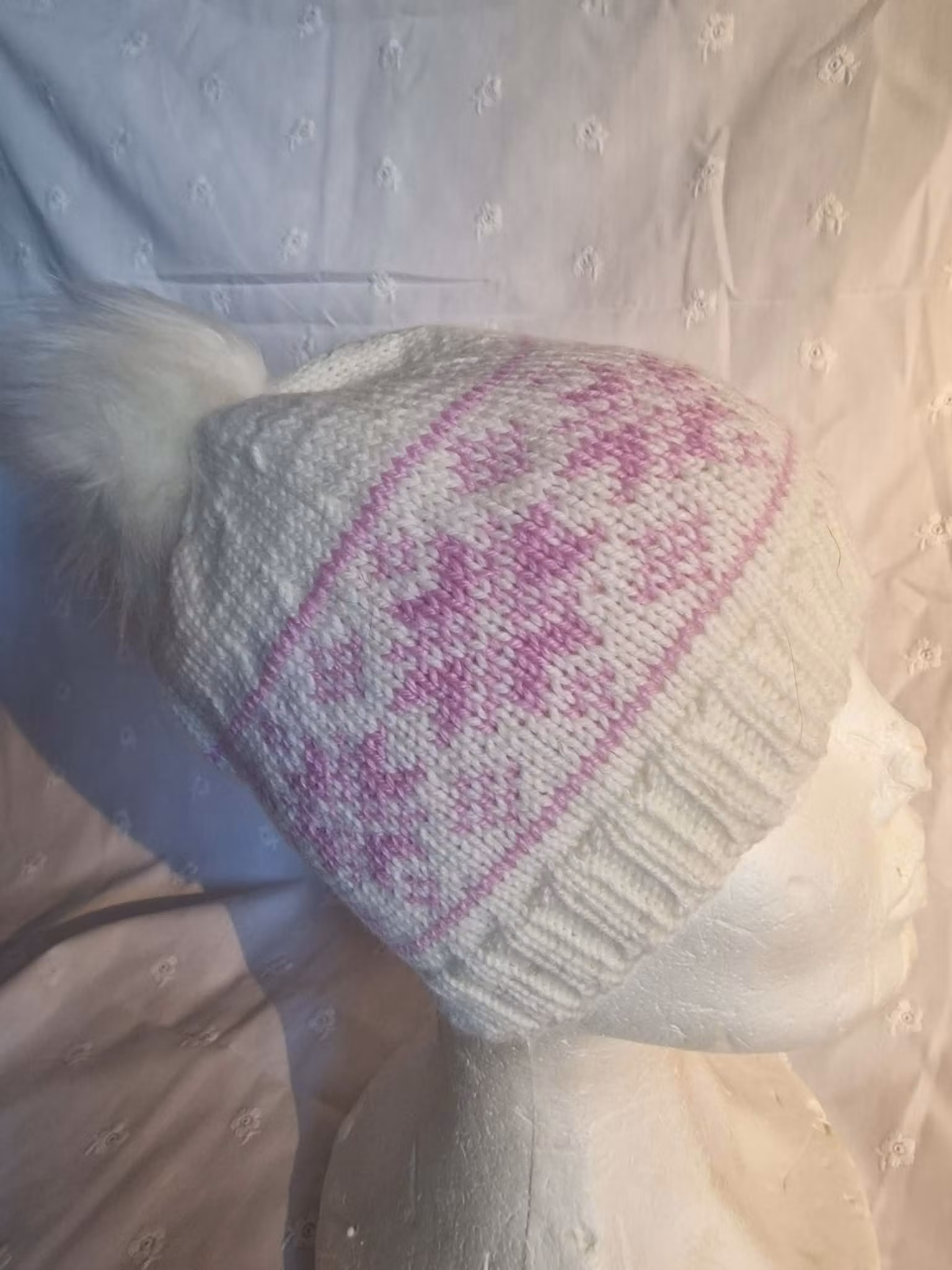 Kjempeflott hvit strikkelue med mønsterbord i fargen lys rosa.