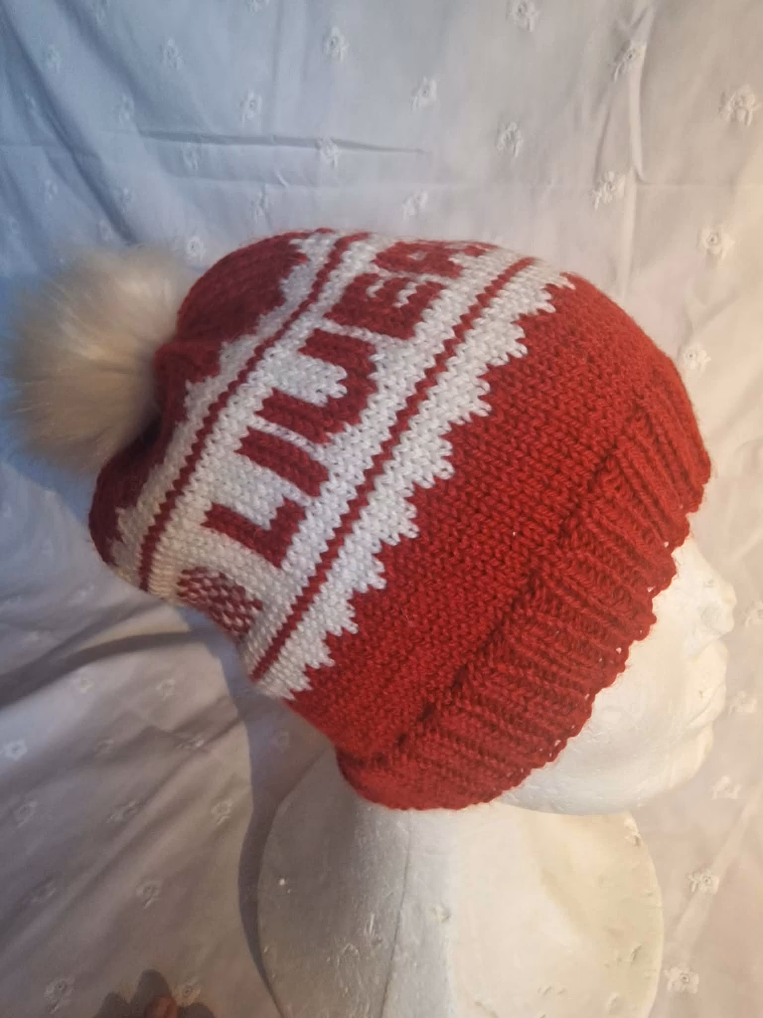 Luen har stor hvit dusk som lett kan tas av ved vask då den er satt på med trykkknapp:)