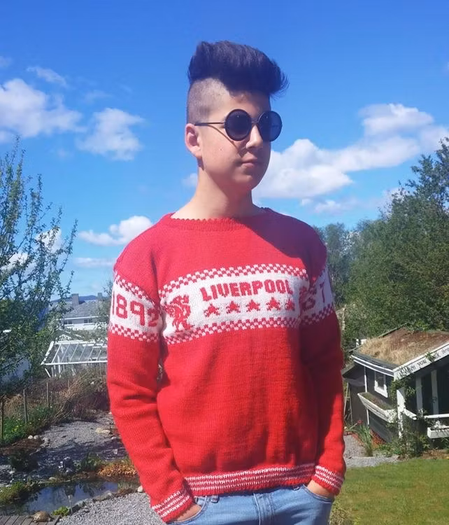 Mønster på ein flott supportergenser som passer både mann og dame, den er strikket i garn med strikkefasthet 23 på 10 cm.
