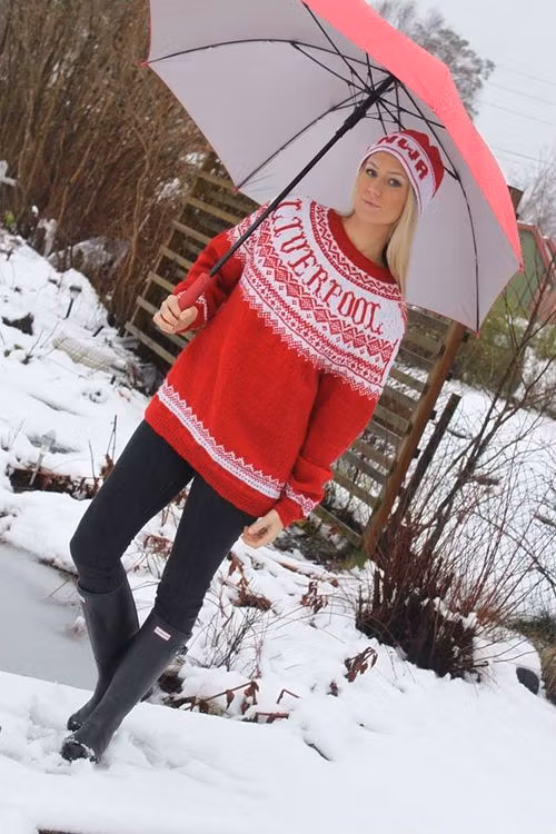 Mønster på ein flott supportergenser som passer både mann og dame, den er strikket i garn med strikkefasthet 23 på 10 cm.