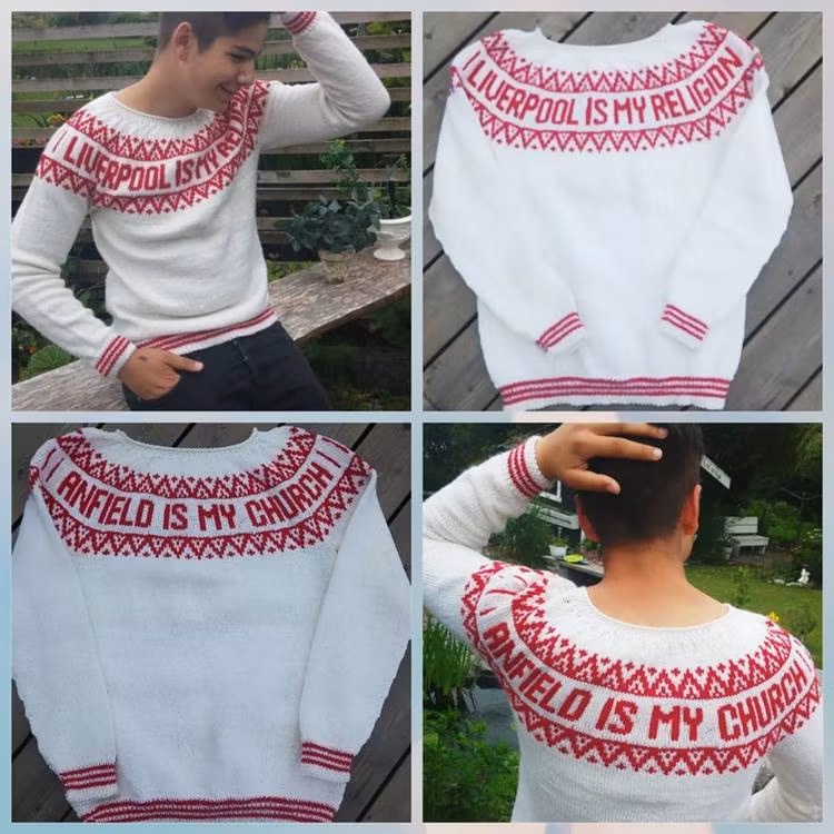 Mønster på ein flott supportergenser som passer både mann og dame, den er strikket i garn med strikkefasthet 23 på 10 cm.