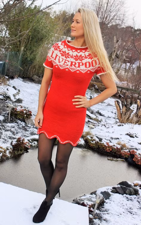 Mønster på ein flott supporterkjole som passer perfekt til den røde  supporteren.  Det er strikket i garn med strikkefasthet 16/17m.  på 10 cm.