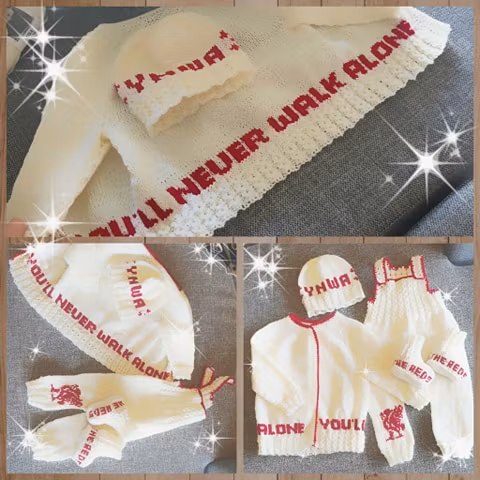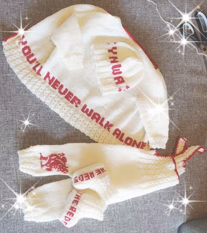 Mønster på ein flott supporter hentesett, det er strikket i garn med strikkefasthet 27 på 10 cm ( baby ull )