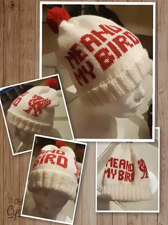 Knallflott supporterlue til den røde supporteren. Den er strikket i garn med strikkefasthet 23 på 10 cm.