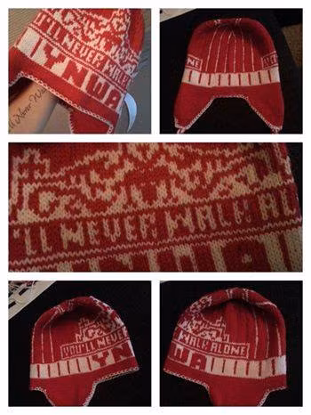 Knallflott supporterlue til den røde supporteren. Den er strikket i garn med strikkefasthet 23 på 10 cm.