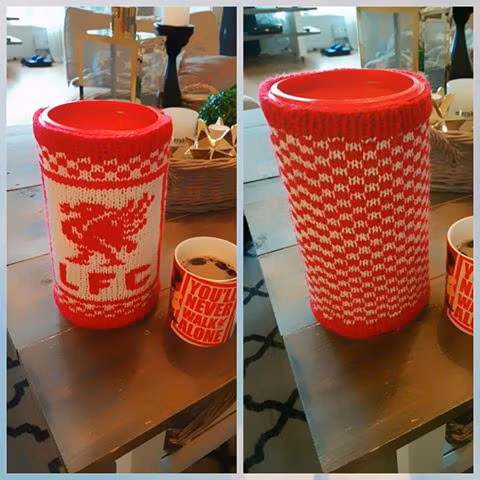 Knallflott supportermønster på tennbrikettboks til den røde supporteren. Dei er strikket i garn med strikkefasthet 23 på 10 cm.